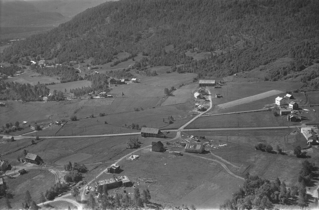 Flyfoto av Heggelia fra 1956. Fjøset som Peder Rusten bygget sist på 1920 tallet midt i bildet. Veien i bakkant av fjøset (på tvers av bildet) er da dagens E6.